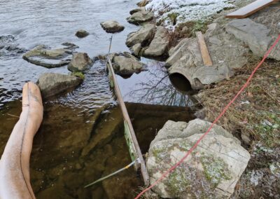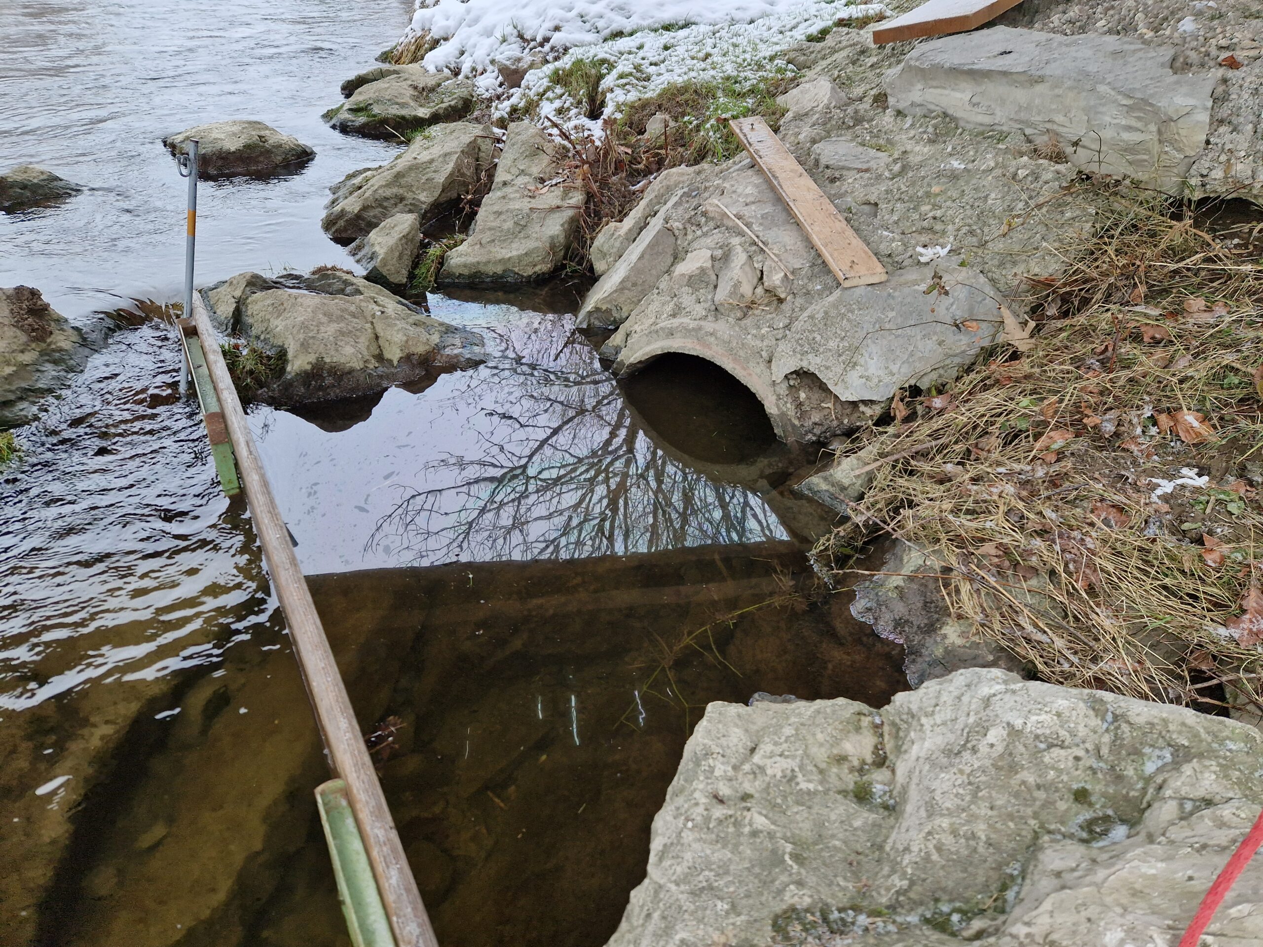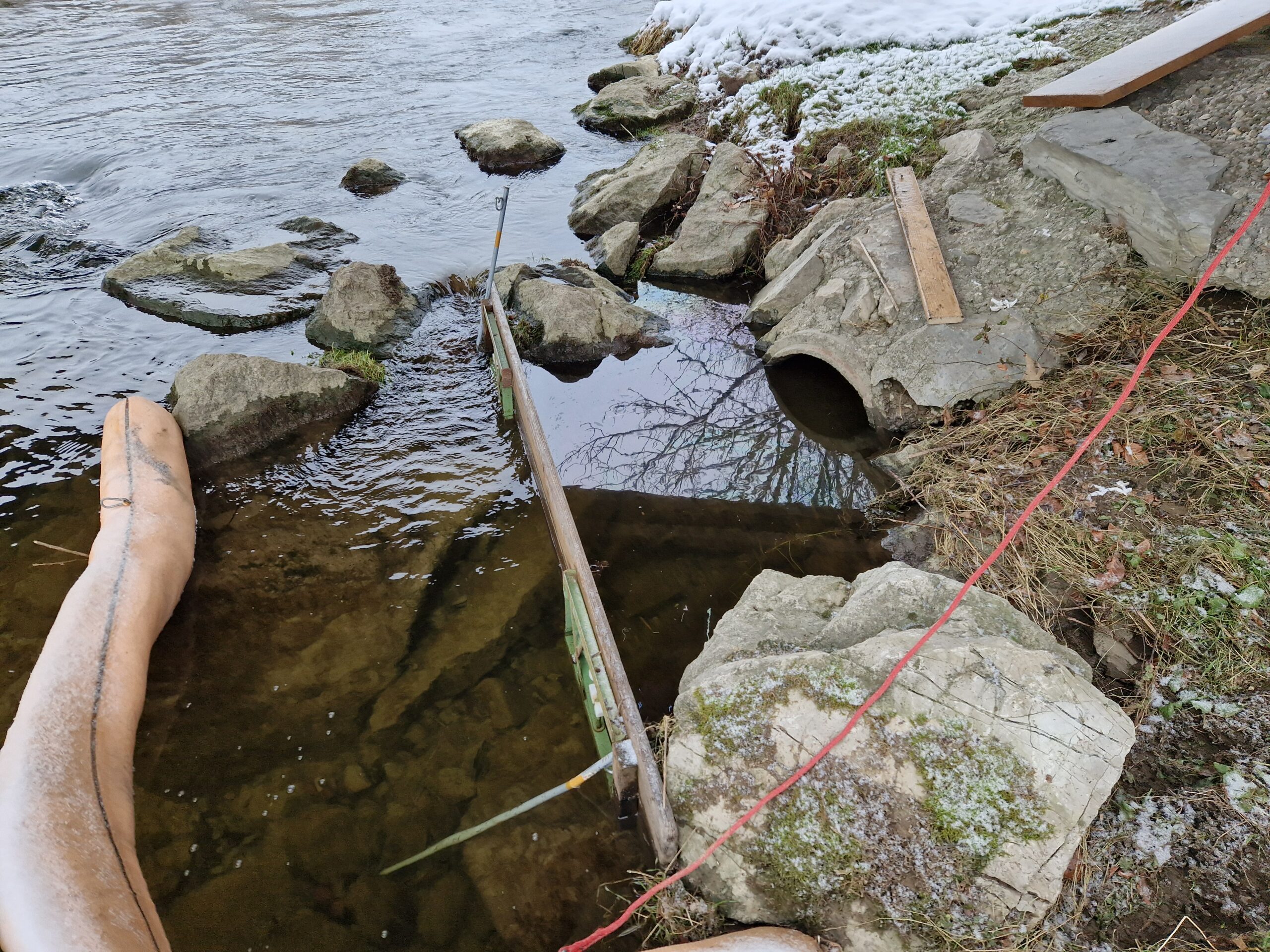 Der Ölaustritt von Freitag, 5. Jänner 2024 im Bereich Schlachthof/Fischach beschäftigte auch am 8. Jänner 2024 wieder die Freiwillige Feuerwehr Bergheim. Ein abermaliger Ölfilm im Bereich der aufgebauten Sperre veranlasste weitere Binde- und Kontrollmaßnahmen.