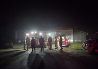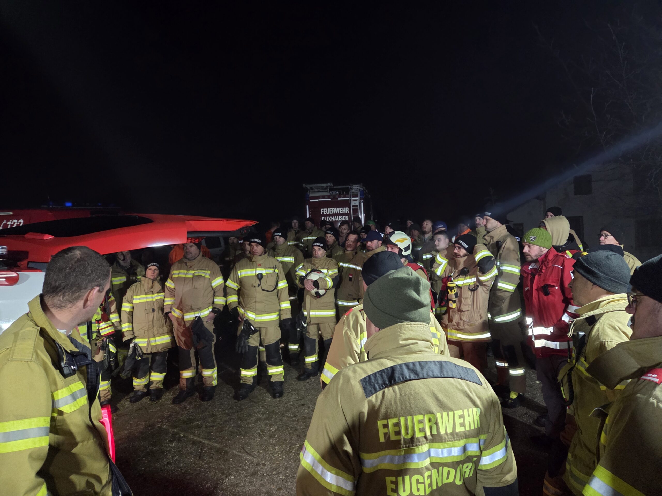Nach Einbruch der Dunkelheit wurde das Suchgebiet nach einer kurzen Lagebesprechung auf einen Radius von 300 Metern rund um das Wohnhaus der vermissten Person eingeschränkt. Mit zahlreichen Scheinwerfern, Taschenlampen sowie Wärmebildkameras durchsuchten die Einsatzkräfte das Gebiet nochmals mittels Menschenkette. Am Abend konnte leider keine Person ausfindig gemacht werden, weshalb der Einsatz am nächsten Tag in den frühen Morgenstunden fortgesetzt wurde.